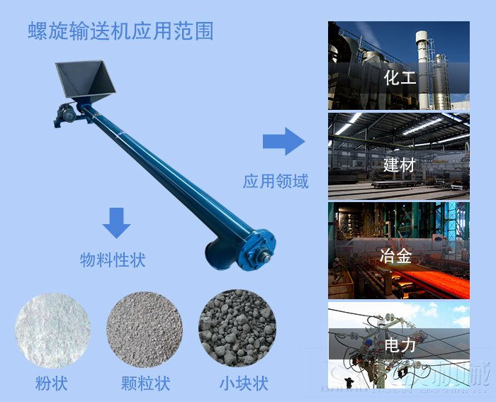 (1)螺旋輸送機(jī)是一種廣泛用于化工,建材,糧食等部門(mén)的輸送設(shè)備。 它主要用于運(yùn)輸粉狀,顆粒狀和小塊狀物料。 它不適用于輸送易于變質(zhì),黏稠和團(tuán)聚的材料。