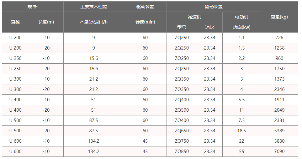 U型螺旋輸送機工作時,電機帶動旋轉的螺旋葉片將物料推移而進行輸送,螺旋輸送機旋轉軸上焊的螺旋葉片,葉片的面型根據輸送物料的不同有實體面型、帶式面型、葉片面型等型式。使物料不與螺旋輸送機葉片一起旋轉的力是物料自身重量和螺旋輸送機機殼對物料的摩擦阻力。參數如下: