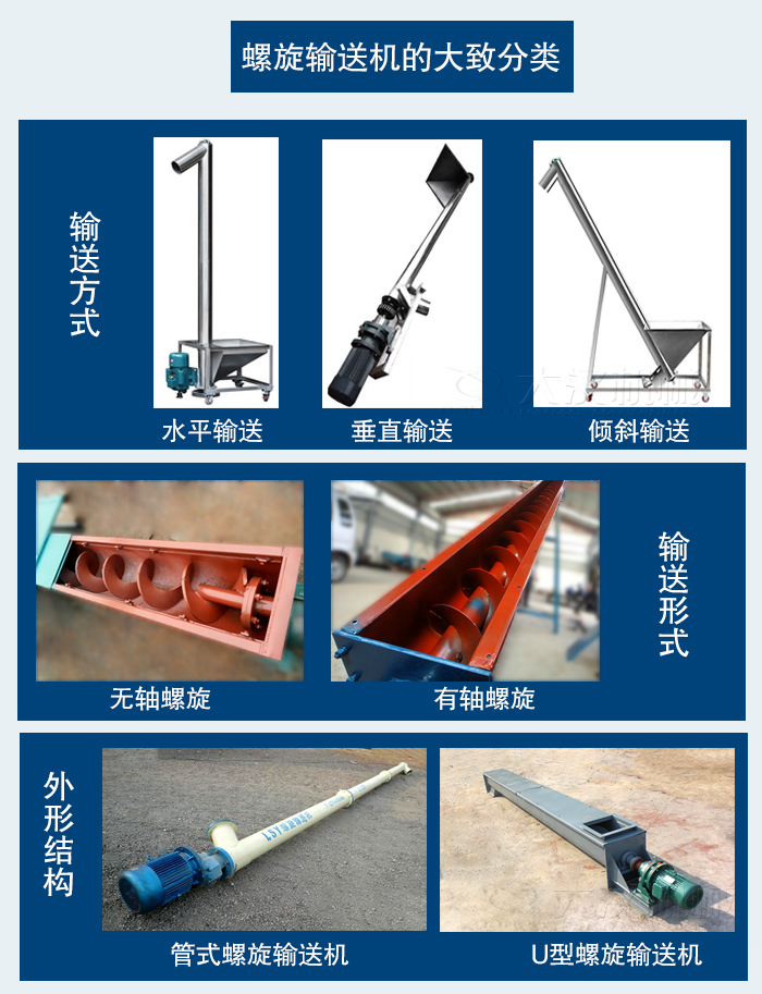 螺旋輸送機從輸送方式上可以分為:水平輸送,垂直輸送,以及傾斜輸送三種。