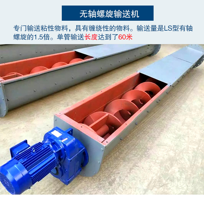 無軸螺旋輸送機又是,在LS型螺旋輸送機的基礎上進行改進的。由于LS型螺旋輸送機結構所以無法輸送一些,有粘性和纏繞性的物料。所以就出現(xiàn)了無軸螺旋輸送機。因此無軸螺旋輸送機就成為了專門輸送一些,粘性物料,具有纏繞性的物料。無軸螺旋輸送機不僅在物料上有所突破,在輸送量上也超過了LS型有軸螺旋的1.5倍。并且單管輸送長度達到了60米的輸送距離。