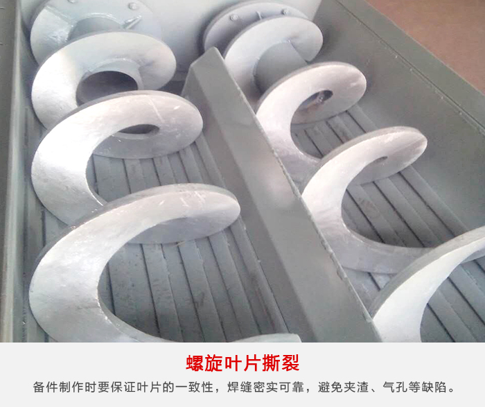 1、由于原料中異物等可造成螺旋葉片損壞,嚴重時螺旋葉片與螺旋軸焊接處脫焊,形成螺旋葉片撕裂,螺旋葉片損壞需提高備件質(zhì)量和強度,在備件制作時要保證葉片的一致性,焊縫密實可靠,避免夾渣、氣孔等缺陷,保證焊接質(zhì)量,同時提高螺旋軸及傳動軸的強度。