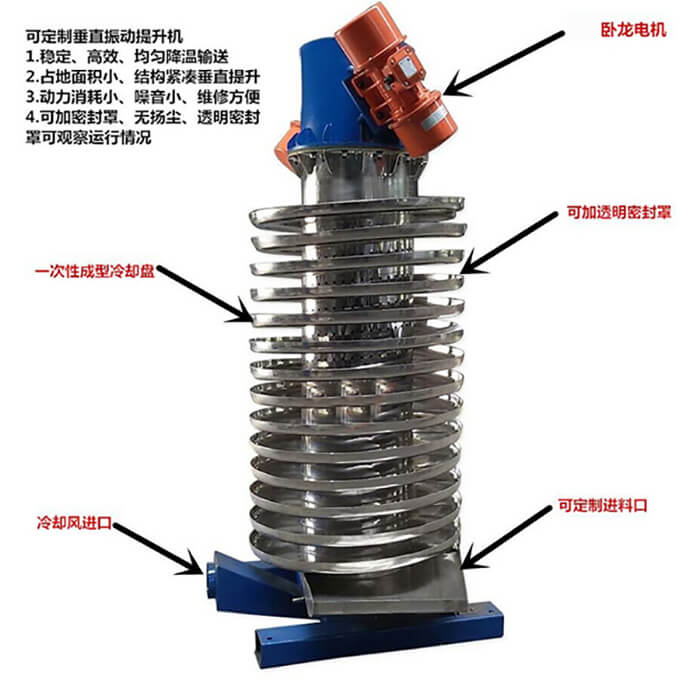 垂直振動螺旋提升機又叫振動螺旋提升機、垂直螺旋提升機、振動垂直提升機等。振動垂直螺旋提升機是一種新型的垂直振動輸送設備,該設備具有蜂窩式底座,全新內管支撐系統本機對一切顆粒狀、塊狀、粉狀的固體物料都可以輸送。