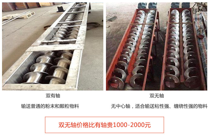 注:雙無(wú)軸螺旋輸送機(jī)價(jià)格比有軸貴1000-2000元,因?yàn)椴捎脽o(wú)軸設(shè)計(jì),可解決易纏繞物料的輸送,且設(shè)計(jì)難度比有軸大。