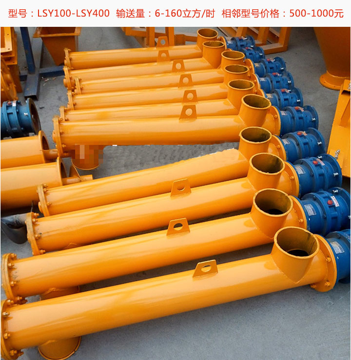 水泥螺旋輸送機常用型號有LSY100,LSY120,LSY140,LSY160,LSY200,LSY250,LSY300,LSY350,LSY400等9種對應的,輸送量為6-160立方/小時,可根據需要的輸送量選擇對應的型號,型號不同對應的價格也不同。