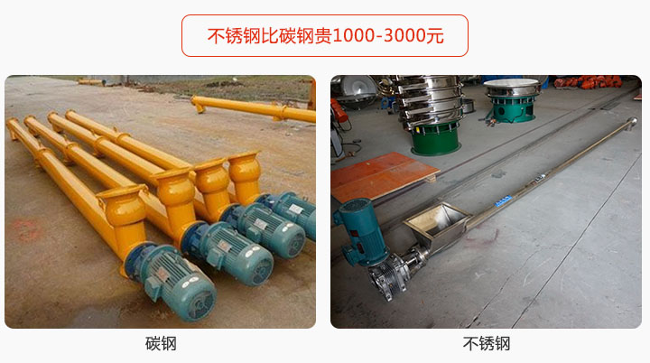 水泥螺旋輸送機有碳鋼和不銹鋼材質,碳鋼材質硬度強,耐磨性強,不銹鋼價格偏貴,其具有良好耐熱性,耐腐蝕性,不生銹,價格偏差為3000元。