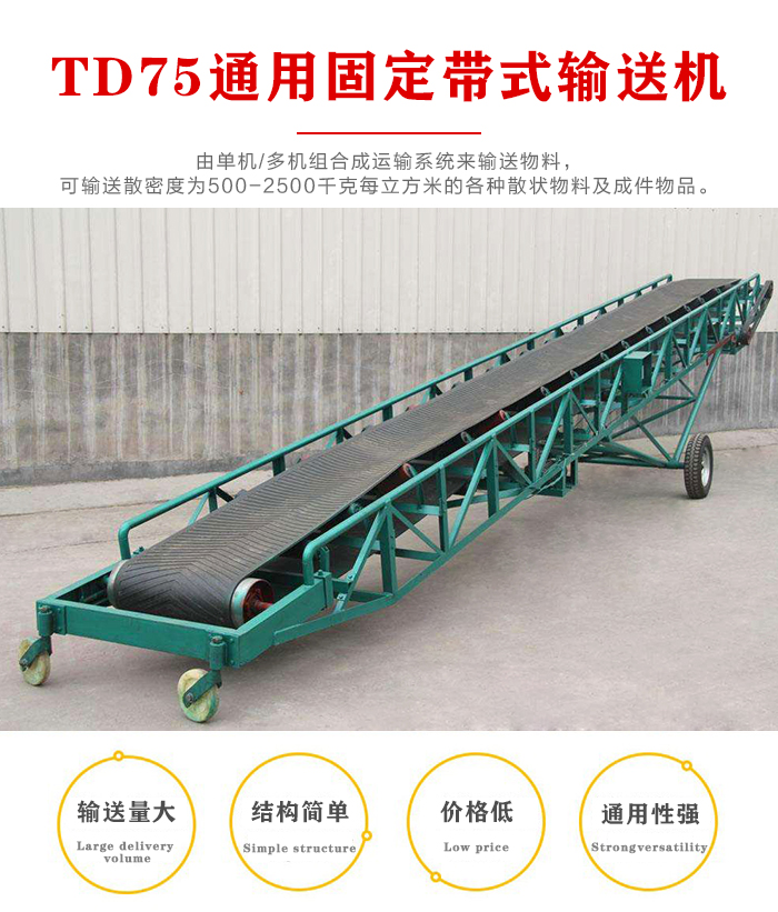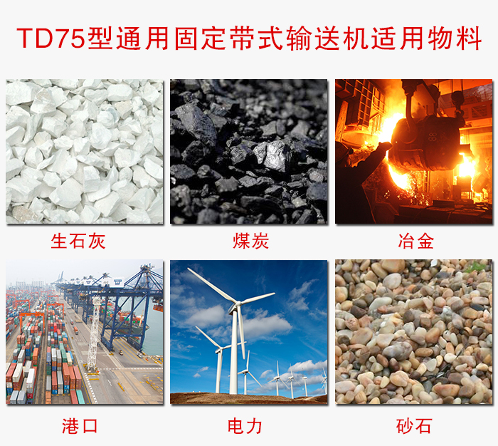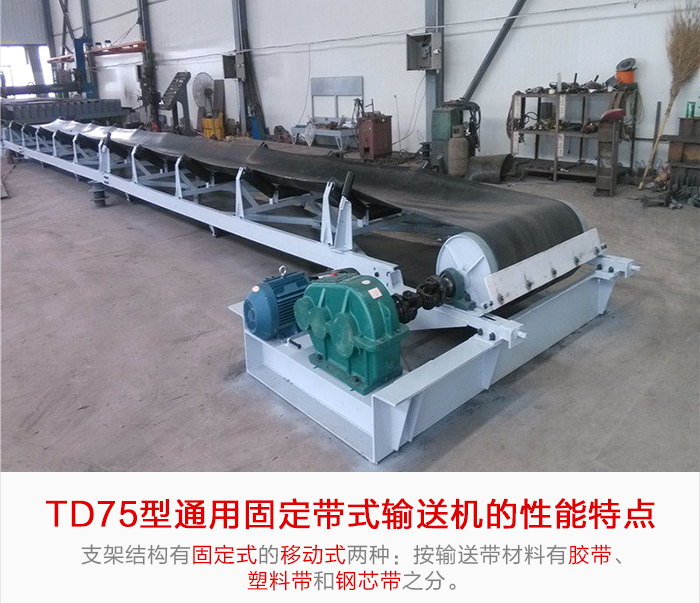 TD75通用固定帶式輸送機由于輸送量大、結構簡單、維護方便、成本低、通用性強等優點,而被廣泛地應用在冶金、礦山、煤炭、港口、交通、水電、化工等部門進行裝車、裝船、轉載或堆積各種常溫狀態的松散密度為500~2500kg/m3各種散狀物料或成件物品。