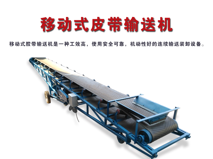移動式皮帶輸送機是一種工效高,使用安全可靠,機動性好的連續輸送裝卸設備。主要用于裝卸地點經常變更動的場所,如:港口、碼頭、車站、煤場、倉庫、建筑工地、沙石料場、農場等,用來短途運輸及裝卸散料或單件重量100公斤以下的成件物品。
