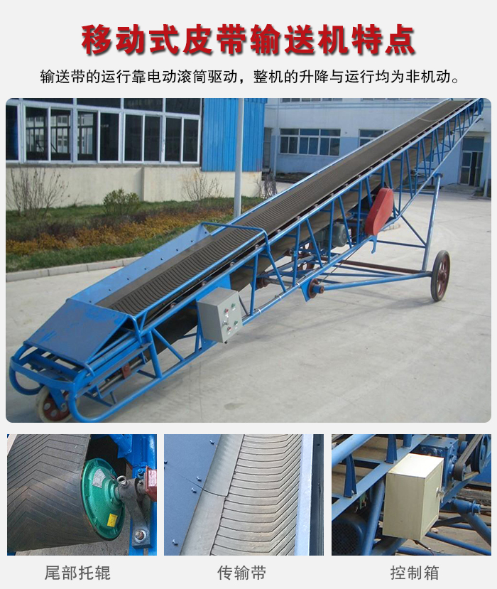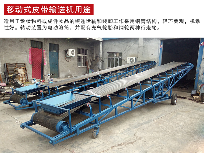 移動式皮帶輸送機適用于散狀物料或成件物品的短途運輸和裝卸工作。采用鋼管結構,輕巧美觀,機動性好。轉動裝置為電動滾筒,并配有充氣輪胎和鋼輪兩種行走輪。機長10米以上且傾角可以調整。