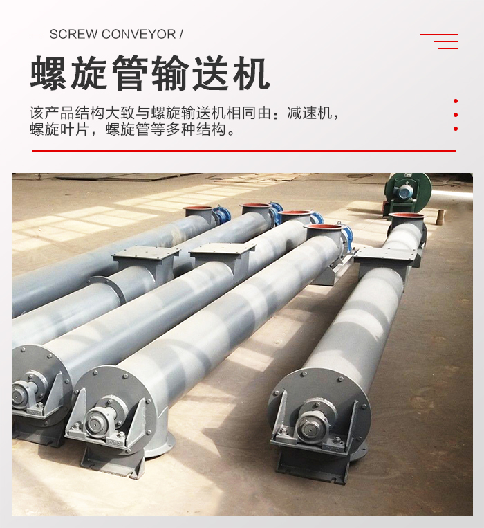 螺旋管輸送機就是螺旋輸送機,準確的說是管式螺旋輸送機。該設備整體由圓管構成,所以很多人稱之為螺旋管輸送機。該產品結構大致與螺旋輸送機相同由:減速機,螺旋葉片,螺旋管等多種結構。