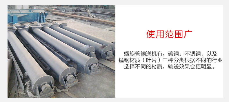 3,產品材質可供多個行業進行選擇,螺旋管輸送機有:碳鋼,不銹鋼,以及錳鋼材質(葉片)三種分類根據不同的行業選擇不同的材質,輸送效果會更明顯。
