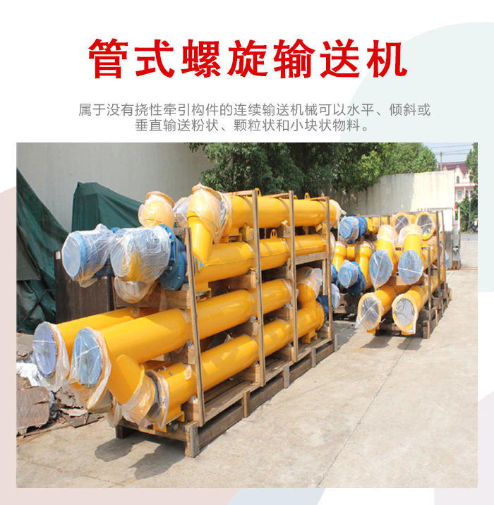 管式輸送機是一種電機帶動螺旋回轉,進而推移物料實現輸送目的的輸送設備,屬于沒有撓性牽引構件的連續輸送機械可以水平、傾斜或垂直輸送粉狀、顆粒狀和小塊狀物料。大漢管式輸送機可分為有軸管式輸送機和無軸管式輸送機,這兩者的區別在于無。送機更易于輸送粘性、纏繞性物料,可以按照用戶物料及應用場合要求設計為不銹鋼材質。能完成輸送、混合、攪拌、松散、加熱以及冷卻等工藝。