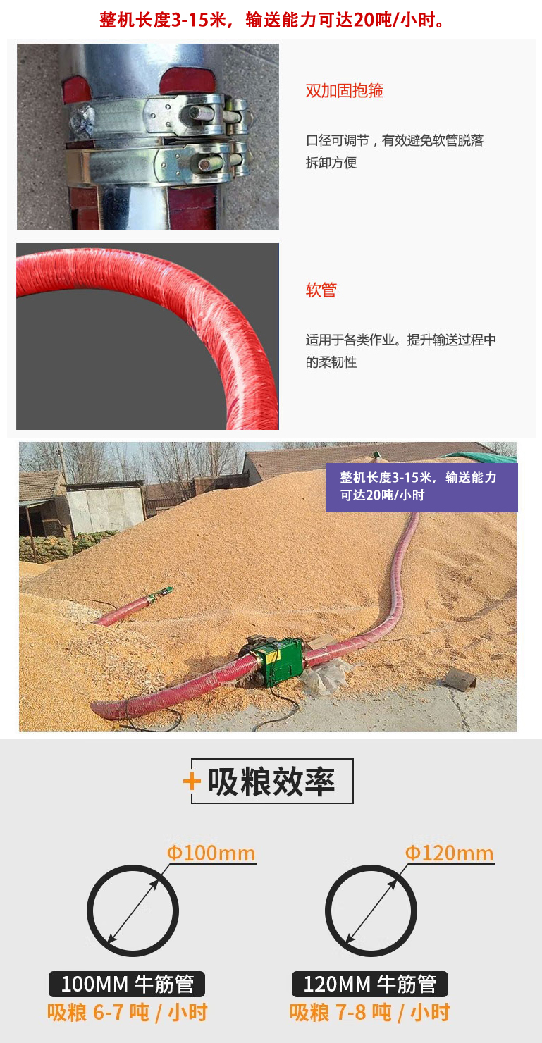 吸糧機長度為3-30米,每小時可輸送20噸糧食。機器的重量是75公斤。它可以水平、傾斜或垂直輸送谷物,糧食垂直輸送時,每小時輸送量可達6噸。