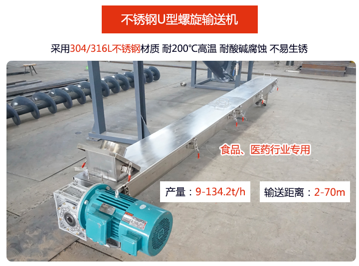 不銹鋼U型螺旋輸送機由于采用了304或316不銹鋼材質,耐磨、耐腐蝕效果非常好,耐高溫:可達200℃可以輸送200℃粉末、顆粒及小塊狀物料,不易生銹及不易污染物料:04或316不銹鋼材質拋光處理,干凈衛(wèi)生,不會生銹,并且設備密封性好,可以避免對輸送物料及環(huán)境造成污染,所以一般在食品、醫(yī)藥等衛(wèi)生要求較為嚴格的行業(yè)中應用較為廣泛,此外,還可用戶普通化工行業(yè),可抵抗弱酸、弱堿性物料的侵蝕。
